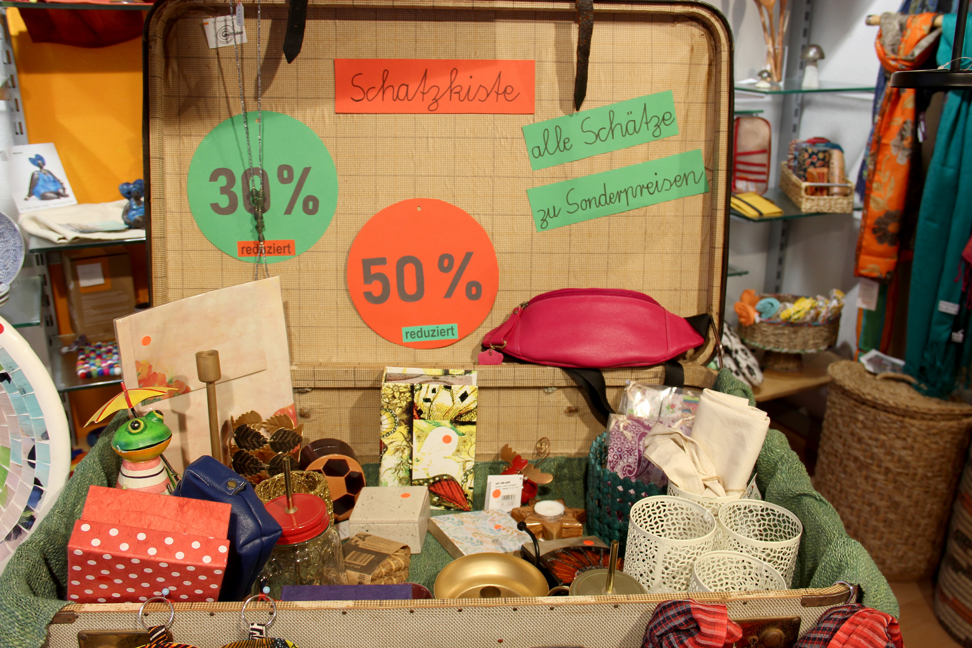 eine lederne, hochwertige Bauchtasche, Wandteller, Kerzenhalter, farbenfrohe Frösche aus Metall, die den Frühling herbeisehnen, verschiedenfarbige Pilze aus Speckstein und vieles andere mehr wartet darauf, entdeckt zu werden.